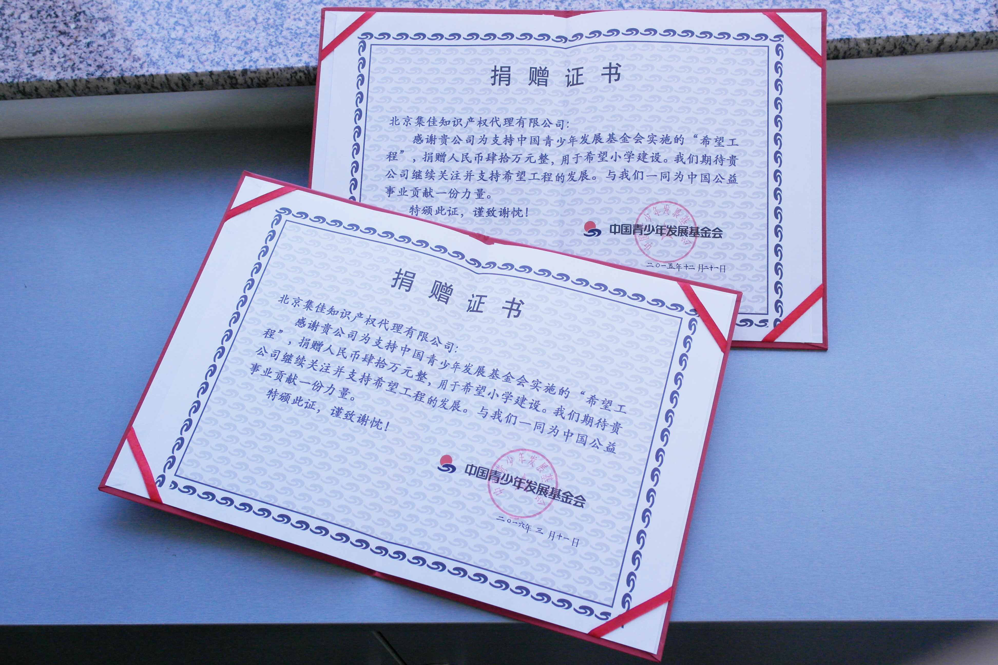 近日,中國青少年發(fā)展基金會向北京集佳知識產(chǎn)權(quán)代理有限公司頒發(fā)捐贈證書,感謝集佳長期支持青基會“希望工程”,并將集佳于2015年和2016年的合計(jì)捐款80萬元納入兩所希望小學(xué)的建設(shè)。至此,集佳第十一、十二所希望小學(xué)援建計(jì)劃成功啟動。