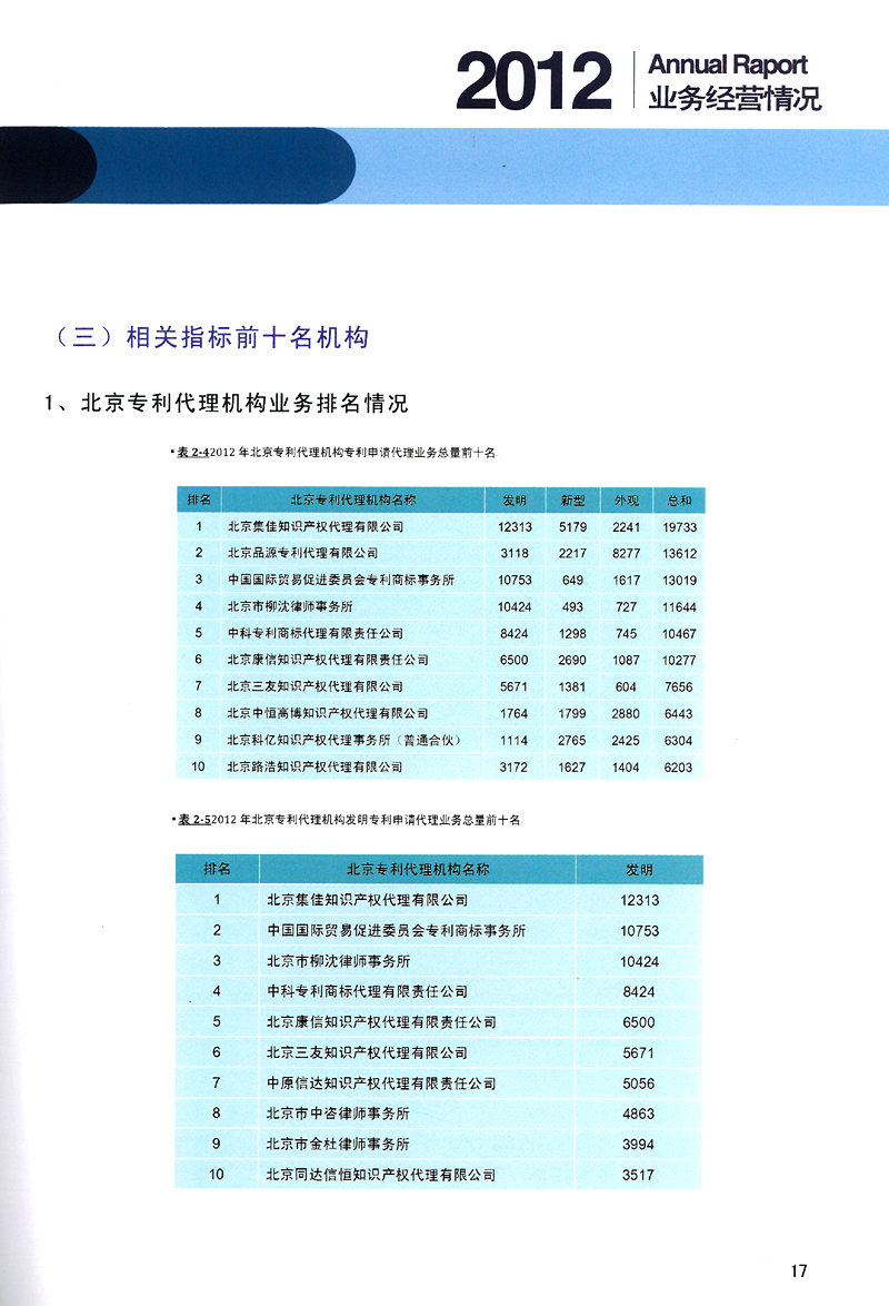 2013-05-31近日,北京市知識(shí)產(chǎn)權(quán)局發(fā)布了《2012年度北京市專利代理年報(bào)》,在北京專利代理機(jī)構(gòu)業(yè)務(wù)排名情況中,最能代表機(jī)構(gòu)實(shí)力而備受關(guān)注的兩個(gè)指標(biāo)分別是“2012年北京專利代理機(jī)構(gòu)專利申請(qǐng)代理業(yè)務(wù)總量前十名”和“2012年北京專利代理機(jī)構(gòu)發(fā)明專利申請(qǐng)代理業(yè)務(wù)總量前十名”,在這兩項(xiàng)排名中,北京集佳知識(shí)產(chǎn)權(quán)代理有限公司均排名第一。