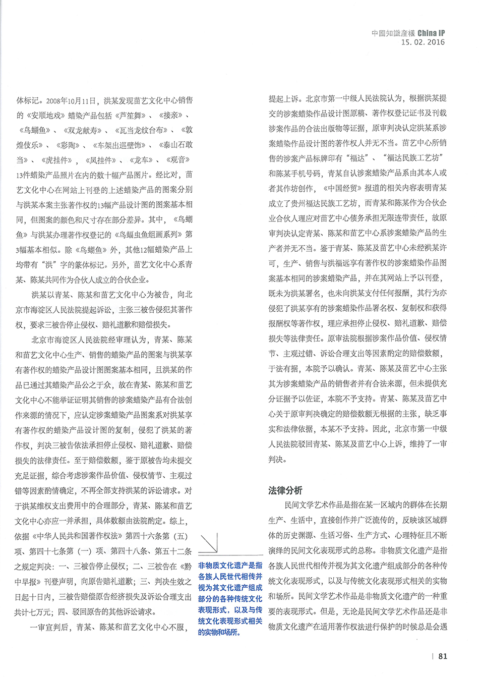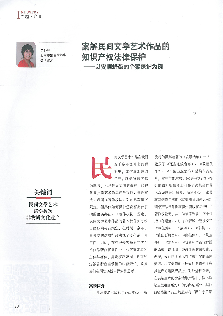 集佳律師李科峰文章《案解民間文學(xué)藝術(shù)作品的知識產(chǎn)權(quán)法律保護(hù)——以安順蠟染的個案保護(hù)為例》在《中國知識產(chǎn)權(quán)》發(fā)表