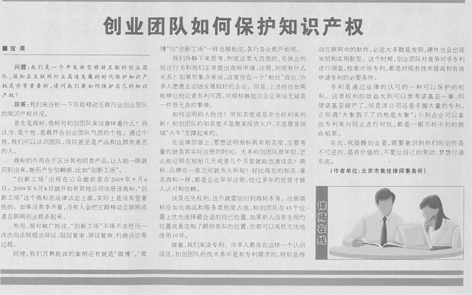 集佳代理人撰文《創(chuàng)業(yè)團隊如何保護知識產(chǎn)權(quán)》在《中國貿(mào)易報》發(fā)表