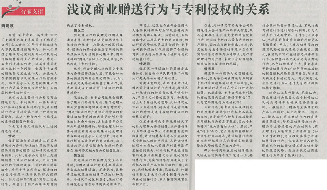 集佳代理人撰文《淺議商業(yè)贈(zèng)送行為與專利侵權(quán)的關(guān)系》在《中國知識產(chǎn)權(quán)報(bào)》發(fā)表