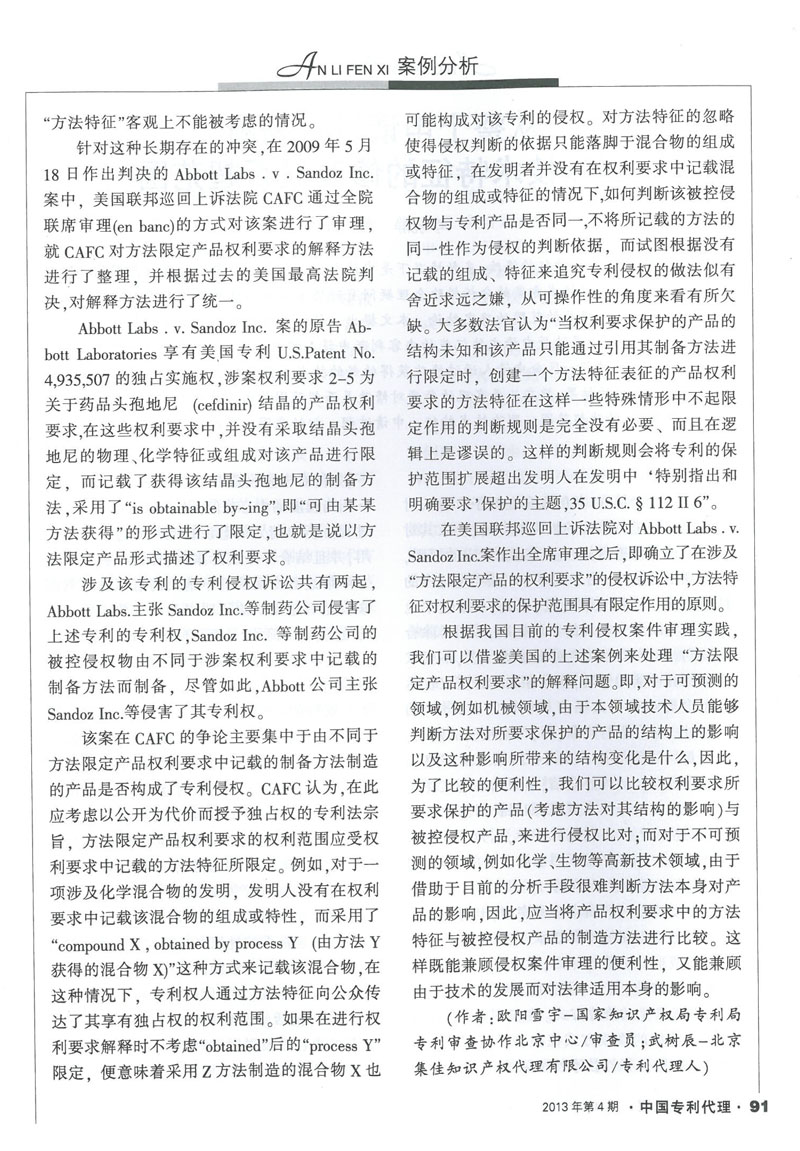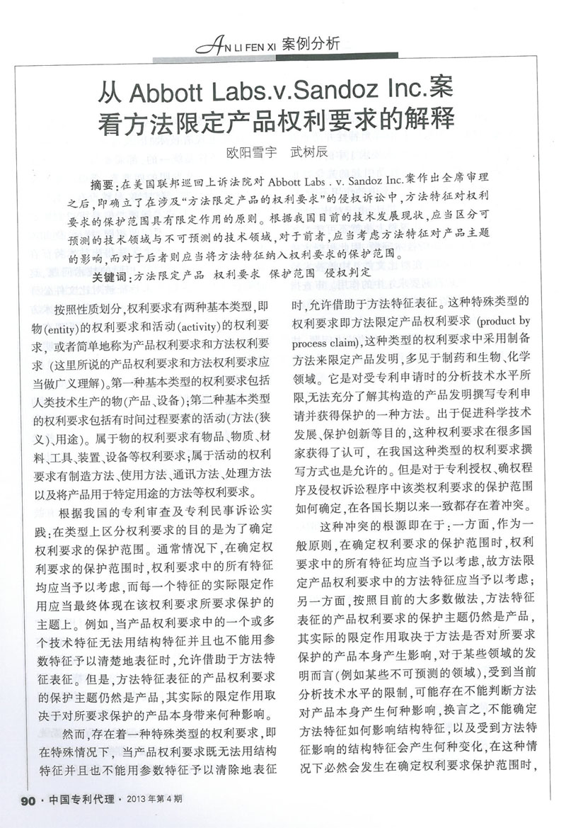 集佳代理人文章《從Abbott Lans.v.SandoZ Inc.案看方法限定產(chǎn)品權(quán)利要求的解釋》在《中國專利代理》發(fā)表