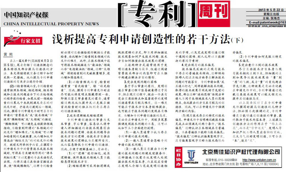 《中國(guó)知識(shí)產(chǎn)權(quán)報(bào)》:淺析提高專(zhuān)利申請(qǐng)創(chuàng)造性的若干方法