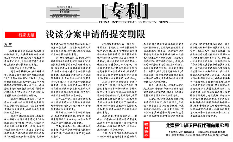 《中國(guó)知識(shí)產(chǎn)權(quán)報(bào)》:淺談分案申請(qǐng)的提交期限