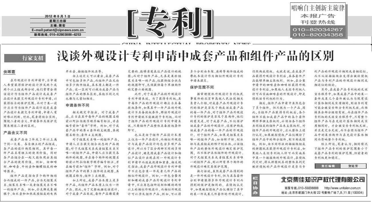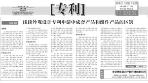 《中國知識產(chǎn)權(quán)報》:淺談外觀設(shè)計專利申請中成套產(chǎn)品和組件產(chǎn)品的區(qū)別