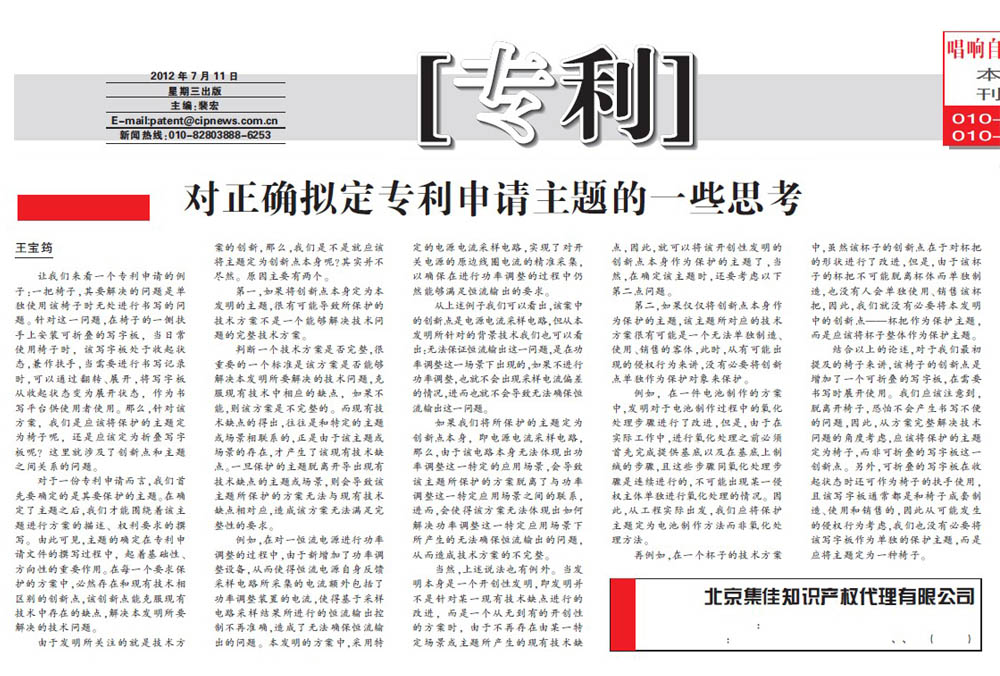 《中國(guó)知識(shí)產(chǎn)權(quán)報(bào)》:對(duì)正確擬定專(zhuān)利申請(qǐng)主題的一些思考