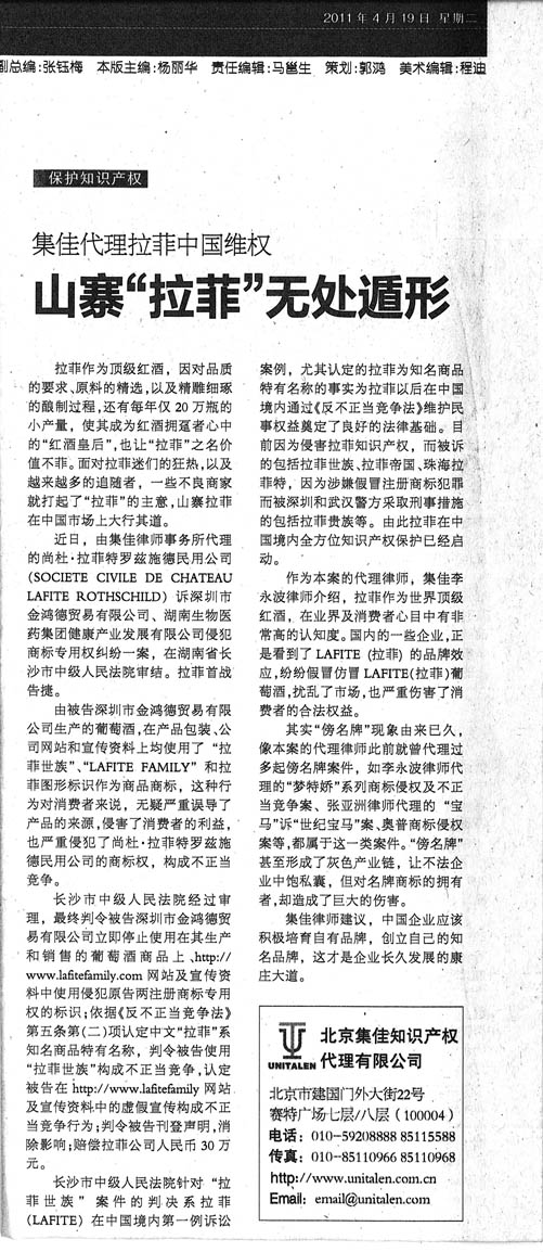 《國(guó)際商報(bào)》:集佳代理拉菲中國(guó)維權(quán)