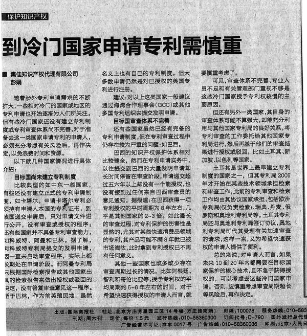 《國(guó)際商報(bào)》:到冷門(mén)國(guó)家申請(qǐng)專利需慎重