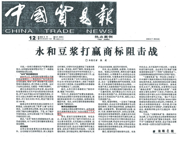 《中國(guó)貿(mào)易報(bào)》:永和豆?jié){打贏商標(biāo)阻擊戰(zhàn)