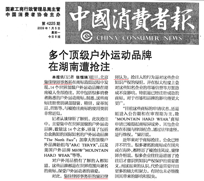 《中國消費(fèi)者報(bào)》:多個(gè)頂級(jí)戶外運(yùn)動(dòng)品牌在湖南遭搶注