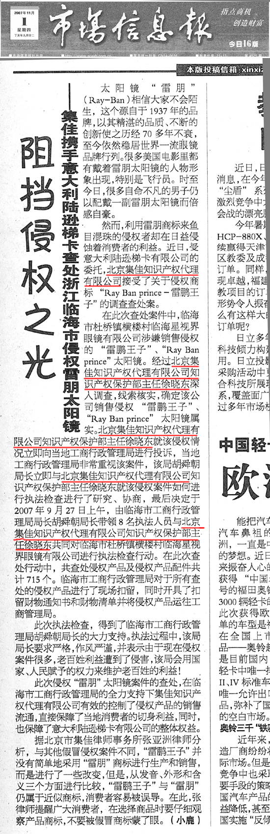 《市場信息報(bào)》:阻侵權(quán)之光——雷朋太陽鏡打假維權(quán)