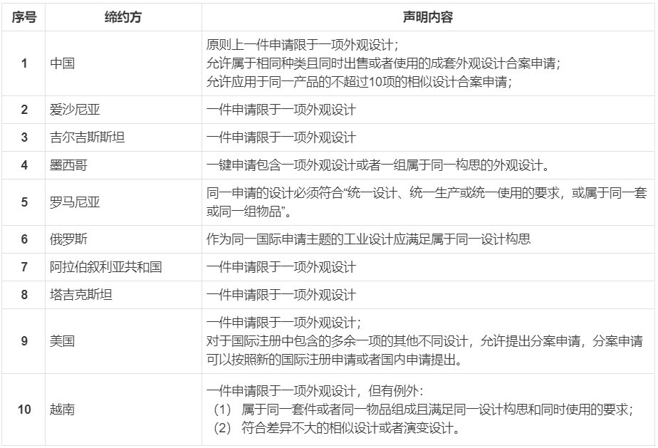 通過海牙體系提交國際注冊申請,一件申請中最多可以包含不超過100項外觀設計,前提是這些外觀設計同屬于同一大類(洛迦諾分類)。不過,并不是所有締約方的法律都放開了合案申請的外觀設計的限制。如果根據其國內法律規(guī)定,不允許就不同外觀設計進行合案或者對合案數(shù)量有所限制,則該締約方必須提前向國際局提出聲明,下列為目前作出聲明的締約方及其聲明的內容: