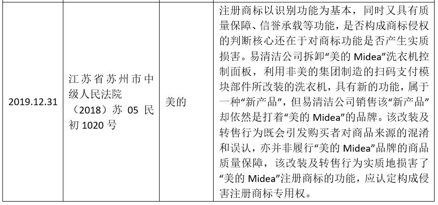 在廣州知識產(chǎn)權(quán)法院一審【(2016)粵73民初2529號】、廣東省高級人民法院二審【(2017)粵民終2659號】、最高人民法院再審【(2019)最高法民申4241號】的多米諾印刷科學(xué)有限公司(以下簡稱為“多米諾公司”)與廣州市杜高精密機電有限公司(以下簡稱為“杜高公司”)、廣州心可工業(yè)設(shè)計有限公司(以下簡稱為“心可公司”)侵害商標(biāo)權(quán)糾紛案件中,從最高人民法院層面明確了此類案件的裁判規(guī)制,即:商品通過正常合法的商業(yè)渠道售出后,再行轉(zhuǎn)售的,通常不構(gòu)成侵權(quán)。但是,如果商品在轉(zhuǎn)售過程中進行了實質(zhì)性改變,導(dǎo)致商品與來源之間的聯(lián)系發(fā)生改變,在該商品上繼續(xù)使用涉案商標(biāo)且未對消費者履行合理告知義務(wù)的情況下,容易導(dǎo)致混淆并損害商標(biāo)權(quán)人的利益,構(gòu)成商標(biāo)侵權(quán)。該案亦因其典型性,再審入選《最高人民法院知識產(chǎn)權(quán)案件年度報告(2020)》55件典型案件,二審入選“2018年廣東知識產(chǎn)權(quán)司法保護十大案件”。