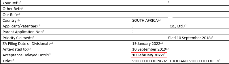 分案申請的授權(quán)決定期限是自PCT申請的提交日2019年9月10日起算的。根據(jù)南非專利法第40條的規(guī)定,授權(quán)絕限是自提交日起18個月。繳納費(fèi)用后,可以延遲授權(quán)至最長不超過3個月。向?qū)彶閱T說明理由(good cause)并繳納費(fèi)用后,審查員會給予專利申請進(jìn)一步延期(可以看出,該案在上述基礎(chǔ)上另外要求了8個月延遲授權(quán))。
