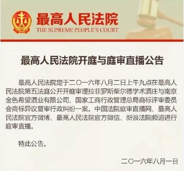 2016年8月1日最高法院通過(guò)其官方微博發(fā)布公告,公布了2016年8月2日將對(duì)“拉菲莊園”案開(kāi)庭與庭審直播的消息。8月2日當(dāng)日,庭審?fù)ㄟ^(guò)中國(guó)法院庭審直播網(wǎng)、最高法院官方微博、最高法院官方微信、新浪法院頻道進(jìn)行了全程直播,庭審持續(xù)了5個(gè)多小時(shí)。