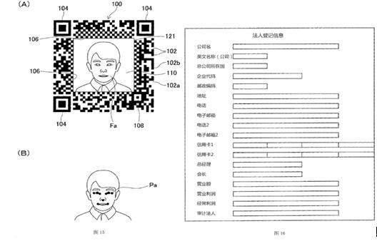 該專利分別保護一種信息碼、信息碼生成方法、信息碼讀取裝置以及信息碼應用系統(tǒng),其中,權利要求14保護一種信息碼,主要采用在介質的碼區(qū)域的內部設置有特定圖案區(qū)域,其中,所述特定圖案區(qū)域中配置有包括表示該碼區(qū)域位置的圖案在內的、預定形狀的特定圖案,所述數(shù)據(jù)存儲區(qū)域通過多個種類的所述單元格存儲該信息碼的被登記在外部裝置中進行管理的數(shù)據(jù),所述圖像區(qū)域以大于單個所述單元格的尺寸來顯示圖像,所述圖像是與所述單元格的圖像不同的圖像并且是該信息碼的被登記在外部裝置中進行管理的圖像。