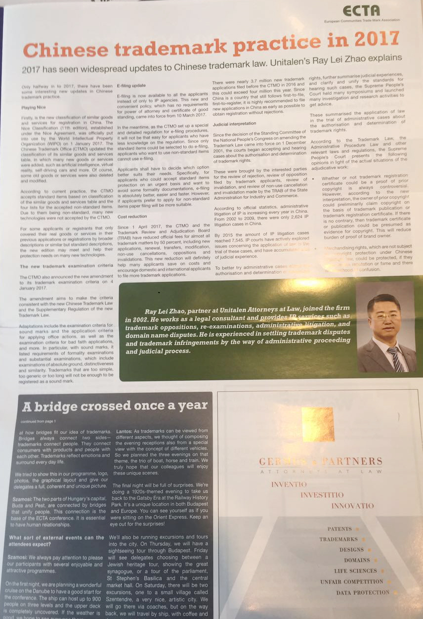 集佳合伙人趙雷文章在歐洲商標(biāo)協(xié)會(ECTA)年會會刊 ECTA Daily 發(fā)表