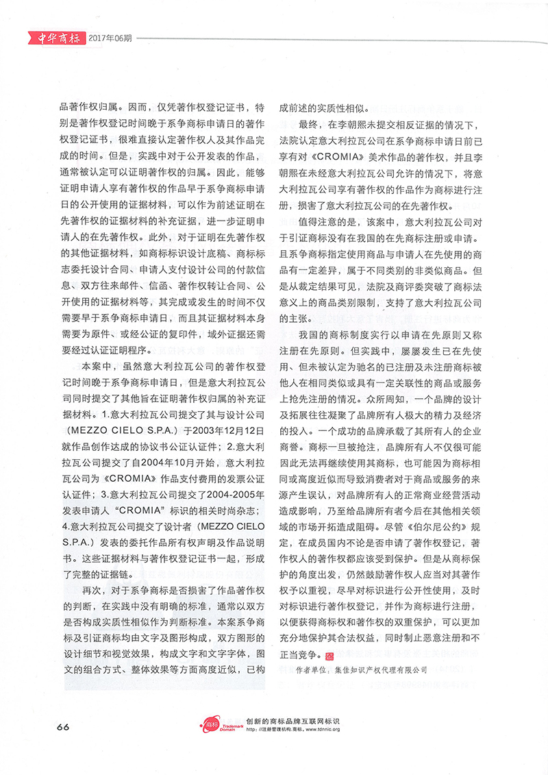 集佳文章《商標(biāo)確權(quán)案中對(duì)在先著作權(quán)的認(rèn)定及保護(hù)》在《中華商標(biāo)》發(fā)表