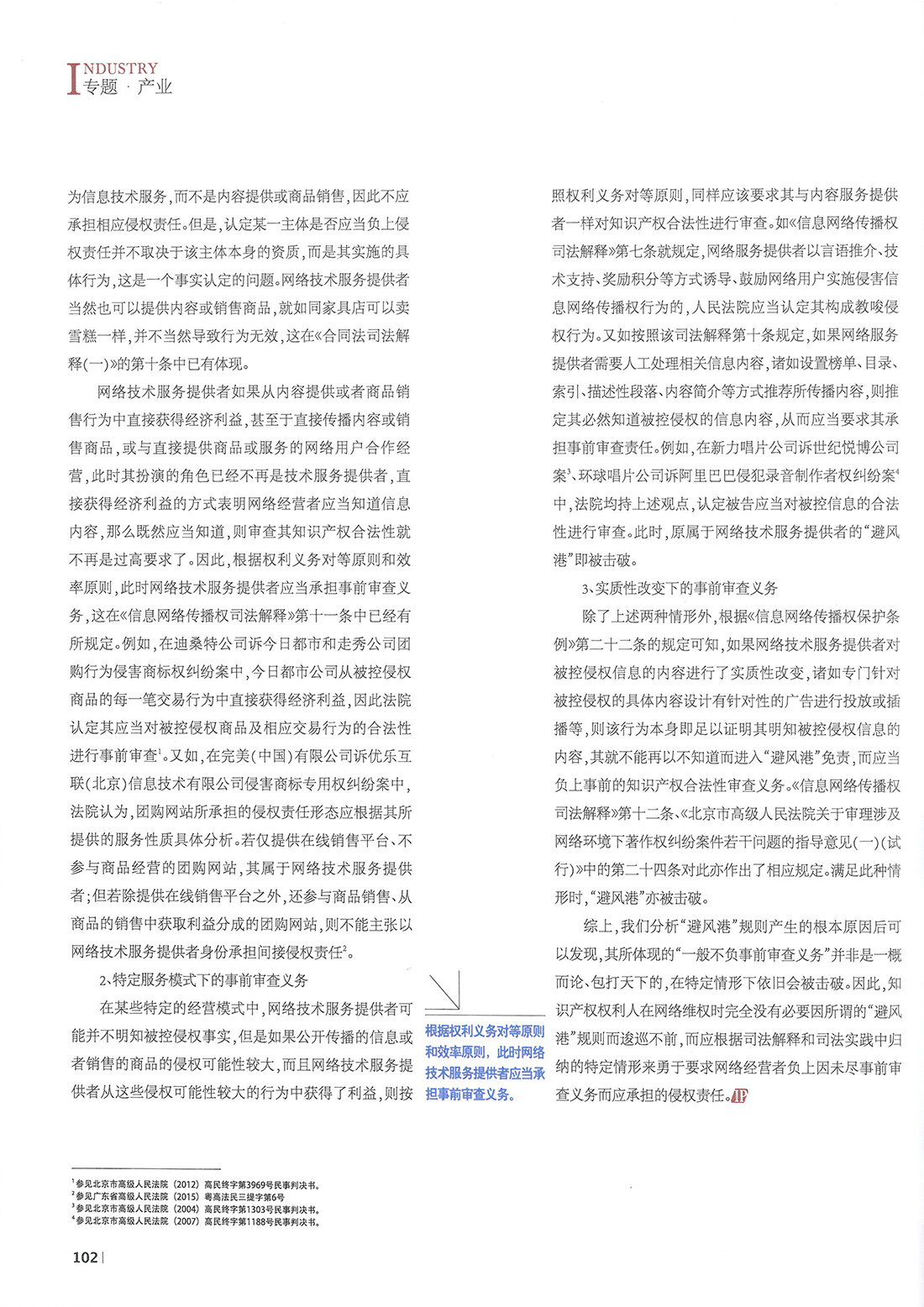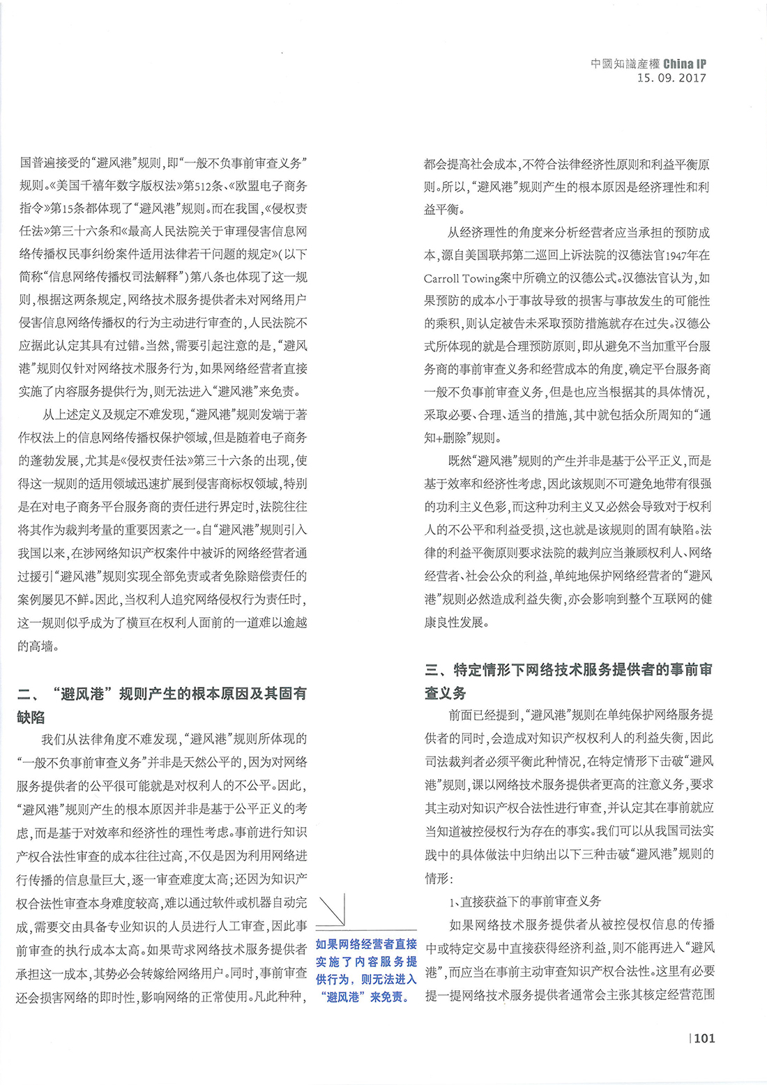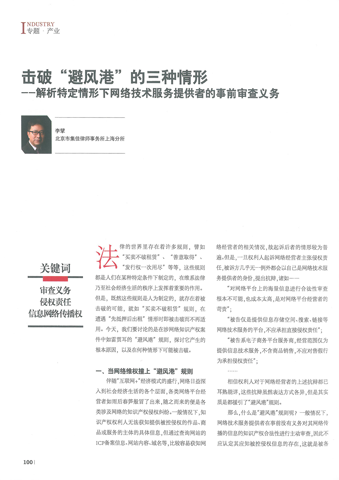 集佳文章《擊破“避風港”的三種情形——解析特定情形下網(wǎng)絡(luò)技術(shù)服務(wù)提供者的事前審查義務(wù)》在《中國知識產(chǎn)權(quán)》發(fā)表