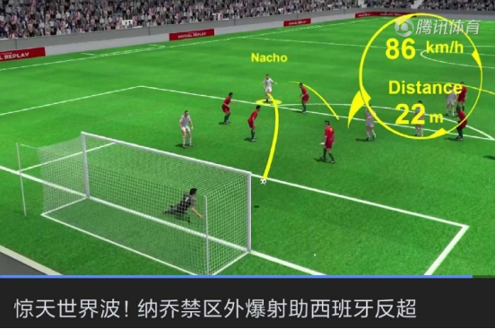 而對(duì)于沒有取得新媒體版權(quán)的一眾媒體平臺(tái),以騰訊體育為例,筆者發(fā)現(xiàn)其在對(duì)世界杯賽事進(jìn)行報(bào)道時(shí)采用動(dòng)畫的形式還原精彩片段,并附加更多相關(guān)數(shù)據(jù),已屬變通方式中的優(yōu)選。