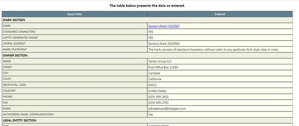 聲音商標(biāo)在官網(wǎng)的頁面上顯示為SENSORY MARK (SOUND),其在申請文件頁面的Mark部分為一段音軌,具體如下: