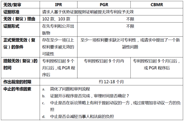 1、行政途徑。AIA修改和新增了三種無效(復(fù)議)程序,分別是Inter Partes Review (簡稱IPR),Covered Business Method Review (簡稱CBMR),和Post-Grant Review (簡稱PGR),由于找不出妥帖的與之對應(yīng)的中文翻譯,故下文均以簡稱特指對應(yīng)的程序。