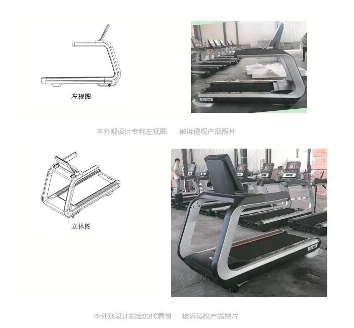 原告經(jīng)調(diào)查發(fā)現(xiàn),被告持有用于制造涉案侵權產(chǎn)品TZ-7000跑步機的專用設備、模具,并在其工廠內(nèi)大量制造、組裝、存儲TZ-7000跑步機產(chǎn)品,并通過互聯(lián)網(wǎng)大量銷售及許諾銷售上述侵權產(chǎn)品。鑒于此,原告泰諾健公司于2016年7月將被告天展公司訴至濟南中院,請求判令被告停止侵權行為,即停止制造、許諾銷售、銷售侵犯原告外觀設計專利權的跑步機產(chǎn)品,并賠償原告實際損失人民幣100萬元及合理維權費用20萬元。被控侵權跑步機產(chǎn)品與涉案專利的外觀設計簡單比對可參見下圖: