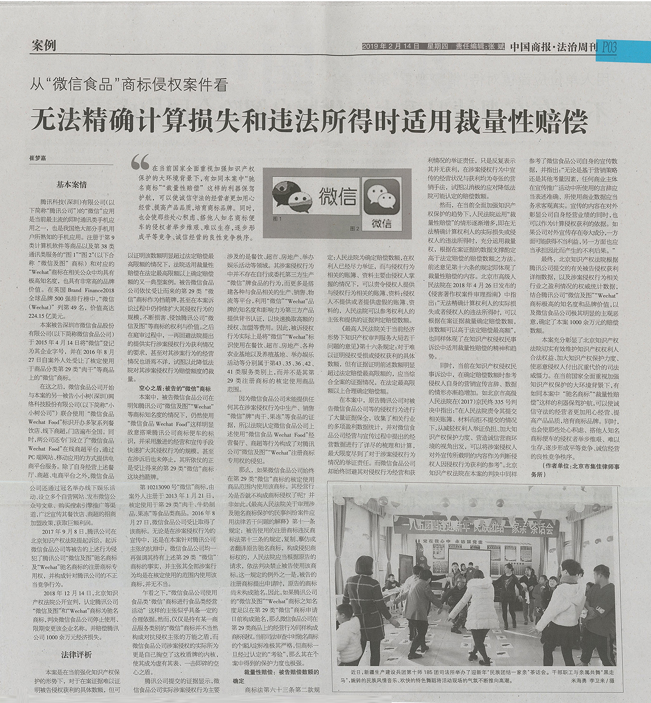 集佳文章《從“微信食品”商標侵權案件看無法精確計算損失和違法所得時使用裁量性賠償》在《中國商報》發(fā)表