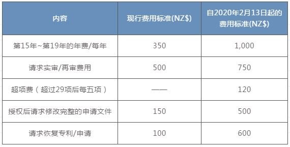 自2020年2月13日起,新西蘭將執(zhí)行新的官費標準,較為重要的費用調整包括:(1)引入超項費;(2)審查費用增加;(3)大大調高了維持費和續(xù)展費,尤其從第15年開始,詳見下表:
