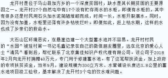 據(jù)了解,龍開村是目前南寧市僅剩的10個(gè)因脫貧指標(biāo)未達(dá)標(biāo)而沒脫貧摘帽的深度貧困村之一。該村山多地薄水少,由于季節(jié)性缺水,飲水困難、飲水衛(wèi)生的問題成為影響當(dāng)?shù)卮迕窕旧畹淖钔怀鰡栴},并深刻制約了當(dāng)?shù)氐慕?jīng)濟(jì)發(fā)展。2018年,北京集佳知識(shí)產(chǎn)權(quán)有限公司了解到這一情況之后,積極幫助龍開村出主意想辦法,并捐贈(zèng)40萬元,在龍開村仲團(tuán)屯修建了蓄水池工程,徹底解決了多年來長(zhǎng)期困擾三個(gè)屯村民的飲水難問題,并改善了農(nóng)業(yè)生產(chǎn)條件,為當(dāng)?shù)卮迕窆?jiān)脫貧提供了信心和希望。2019年5月13日,龍開村黨支部第一書記毛鑫等一行4人代表村民為集佳贈(zèng)送“愛心傾注龍開蓄水池,精準(zhǔn)扶貧深度貧困村”錦旗,表達(dá)了龍開村民的真誠(chéng)謝意。