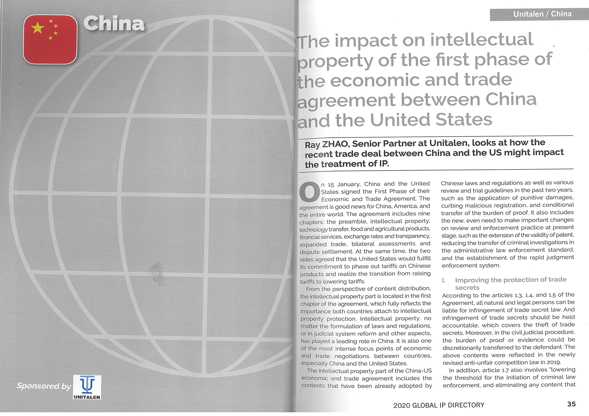 集佳合伙人趙雷律師文章《The impact on intellectual property of the first phase of the economic and trade agreement between China and the United States》在《2020 GLOBAL IP DIRECTORY》發(fā)表