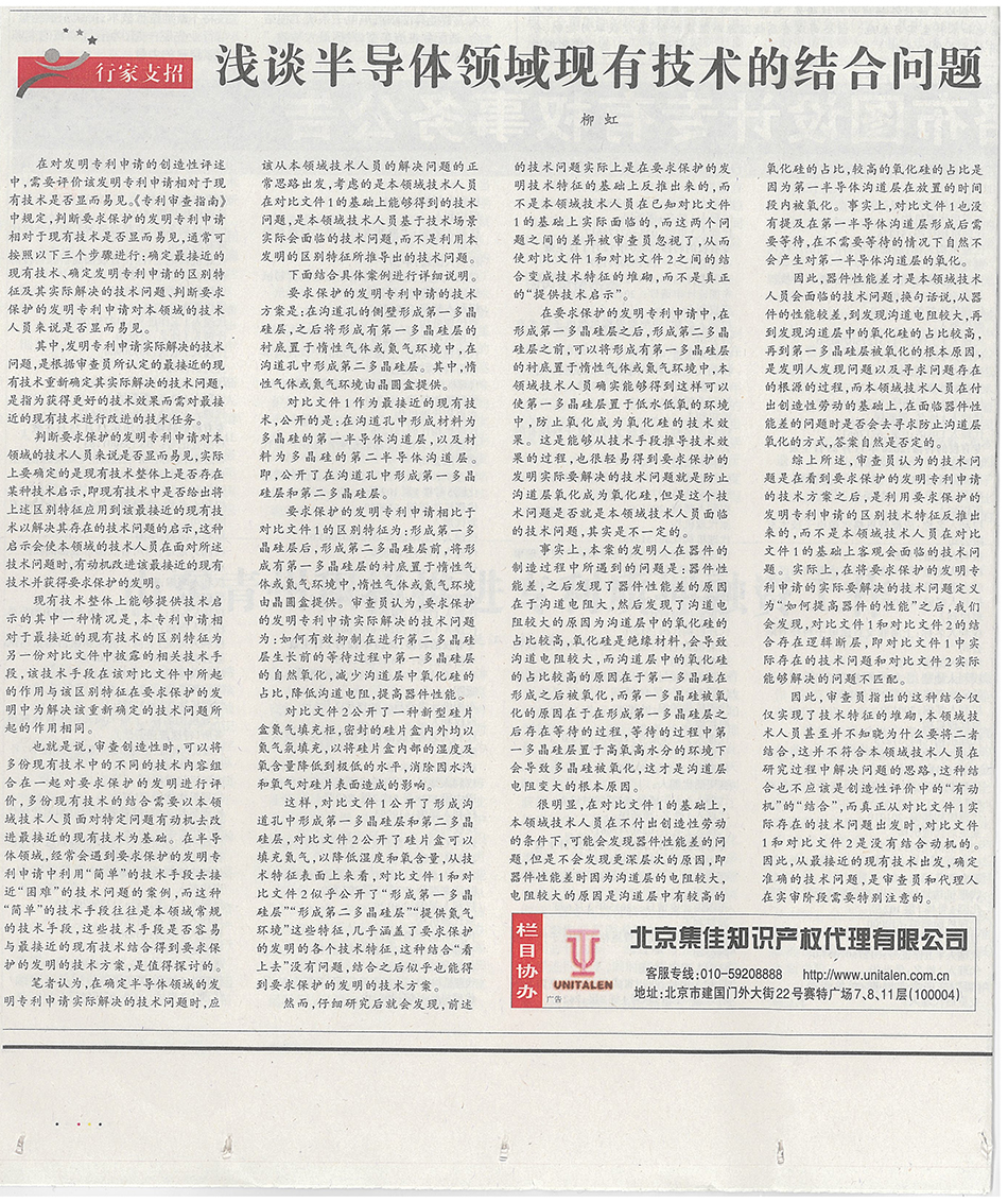 集佳文章《淺談半導(dǎo)體領(lǐng)域現(xiàn)有技術(shù)的結(jié)合問題》在《中國知識產(chǎn)權(quán)報》發(fā)表