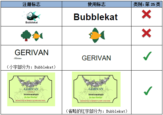 若注冊(cè)標(biāo)識(shí)本身具有中等強(qiáng)度的顯著性,在此基礎(chǔ)上省略的為非顯著要素或弱顯著要素,則一般視為注冊(cè)標(biāo)識(shí)的使用。但若省略的部分為主要視覺部分,或與注冊(cè)標(biāo)志中其他元素有相互作用的關(guān)聯(lián)關(guān)系,則其省略可能會(huì)造成顯著部分的實(shí)質(zhì)變更。如: