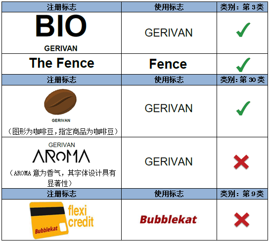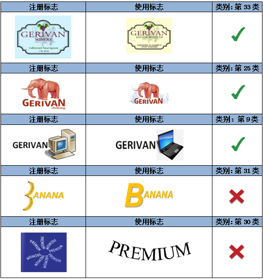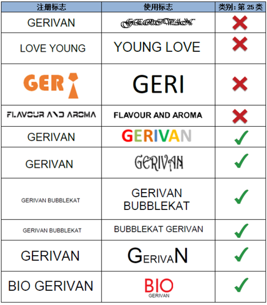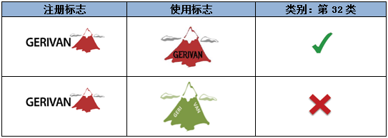 如上述示例,注冊(cè)商標(biāo)指定在第32類礦泉水商品上,相較而言,圖形對(duì)指定商品具有一定暗示性,而顯著性較弱。因此,文字部分“GERIVAN”為該注冊(cè)商標(biāo)的主要顯著部分。第一組中的使用標(biāo)志僅是對(duì)圖形和文字的位置進(jìn)行了調(diào)整,不影響文字部分的顯著性。而第二組的使用標(biāo)志對(duì)文字進(jìn)行了拆分,形成了新的商業(yè)印象,故視為實(shí)質(zhì)變更。