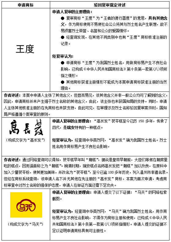 但是,只要與烈士名稱相同,則無法注冊為商標(biāo)使用嗎?當(dāng)然不是,以下將分別分析通過駁回復(fù)審予以駁回,以及通過駁回復(fù)審準(zhǔn)予注冊兩種情況,來明晰如何克服與烈士名稱沖突的商標(biāo)申請案件。