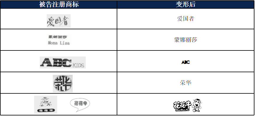 ”被認(rèn)定構(gòu)成“變形使用”、侵權(quán)成立。(2)若由于商業(yè)使用環(huán)境等客觀需要,導(dǎo)致被訴標(biāo)識(shí)與注冊(cè)樣式稍有差別,一般不輕易判為“變形使用”,如“蒙娜麗莎”“愛國(guó)者”“ABC”等案件。法院認(rèn)為,被訴標(biāo)識(shí)雖與注冊(cè)商標(biāo)有所差異,但未改變顯著特征,仍屬于對(duì)注冊(cè)商標(biāo)的合理使用。
