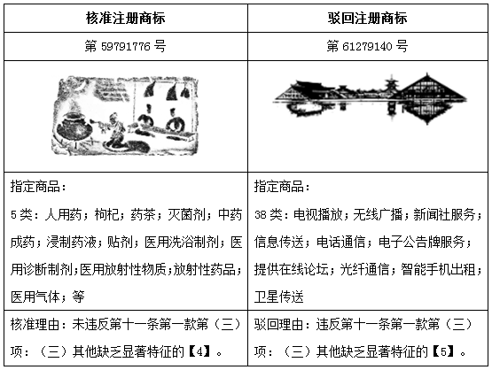 相比較之下,上表中的被駁回案例比較容易判斷,為某處景觀的偏寫實(shí)圖案,同《商標(biāo)審查審理指南》中案例的情形高度類似,過于細(xì)致而無特點(diǎn)的設(shè)計(jì)不會形成獨(dú)特而深刻的印象,即使作為商標(biāo)印刷在產(chǎn)品外包裝上,十分容易被理解為外包裝的裝飾性圖案,難以發(fā)揮商標(biāo)應(yīng)有的區(qū)分商品來源的功能。