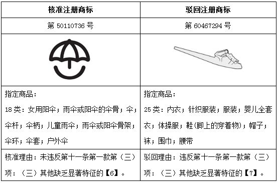 上述核準(zhǔn)案例中的“傘”圖形用在“陽傘”等商品上,并非直接表達(dá)了商品的外觀或特點(diǎn),其圖形整體呈現(xiàn)了一種愉悅又可愛的視覺感受,且并非行業(yè)通用圖形,予以注冊無可厚非。但駁回案例中的“鞋”圖形,為普通的鞋子外觀,站在消費(fèi)者的角度判斷,在鞋子或服飾商品上標(biāo)識鞋子圖形,理解為商品的裝飾性圖案似乎更符合常理,由此,難以作為商標(biāo)被核準(zhǔn)注冊。