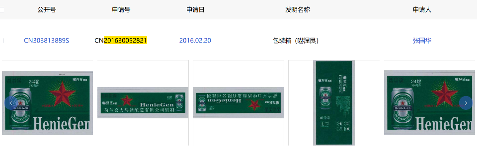 被告張國華于2016年將與喜力公司商標(biāo)近似的圖案、文字作為啤酒商品的包裝物申請(qǐng)了201630052864.8號(hào)和201630052821.X號(hào)外觀設(shè)計(jì)專利權(quán)。