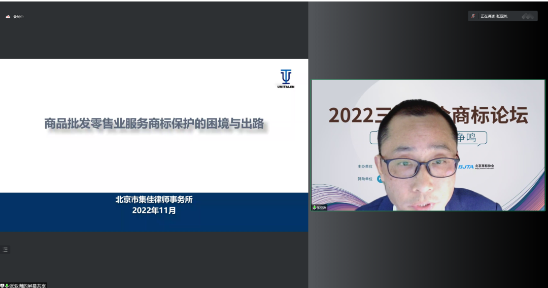2022年11月26日下午,由北京商標(biāo)協(xié)會(huì)、北京知識(shí)產(chǎn)權(quán)研究會(huì)、北京大學(xué)法學(xué)院校友會(huì)三會(huì)首次聯(lián)合舉辦的“商標(biāo)法研究百家爭鳴——2022年商標(biāo)論壇”通過線上方式成功舉辦,多位業(yè)內(nèi)大咖基于中國商標(biāo)法的法律實(shí)踐,進(jìn)行了一場學(xué)術(shù)上的百家爭鳴。集佳合伙人張亞洲律師應(yīng)邀參加論壇并作主題演講。
