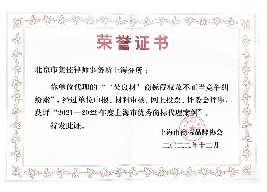 集佳上海分所代理的“吳良材”商標(biāo)侵權(quán)及不正當(dāng)競(jìng)爭(zhēng)糾紛案被評(píng)為“2021-2022年度上海市優(yōu)秀商標(biāo)代理案例”。“吳良材”案歷經(jīng)一審、二審、再審審查、抗訴審查程序,耗時(shí)六年,終于落下了帷幕。本案司法機(jī)關(guān)所遵循的“尊重歷史、禁止混淆、誠實(shí)信用、利益平衡”的老字號(hào)知識(shí)產(chǎn)權(quán)司法保護(hù)理念,既尊重歷史所形成的事實(shí),為被告保留相應(yīng)發(fā)展空間,又依據(jù)商標(biāo)法的規(guī)定合理保護(hù)注冊(cè)商標(biāo)專用權(quán),禁止混淆性使用,具有相當(dāng)?shù)牡湫鸵饬x。