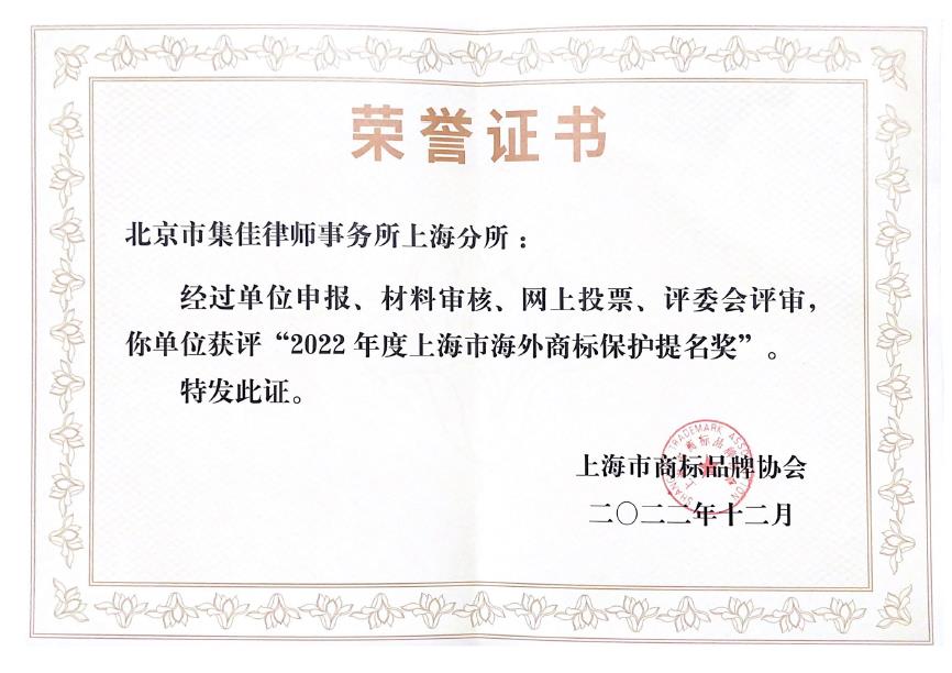 同時(shí),集佳上海分所獲評(píng)“2022年度上海市海外商標(biāo)保護(hù)提名獎(jiǎng)”,以表彰集佳上海分所在幫助中國企事業(yè)單位處理國際商標(biāo)品牌事務(wù)上取得的優(yōu)異成績(jī)。隨著中國經(jīng)濟(jì)的發(fā)展和企業(yè)的成長(zhǎng),集佳上海分所依托總部的支持,長(zhǎng)期致力于為眾多中國企業(yè)處理海外商標(biāo)注冊(cè)、國際保護(hù)和品牌運(yùn)營(yíng)等法律事務(wù),以實(shí)際行動(dòng)助力中國市場(chǎng)主體走向海外市場(chǎng)并應(yīng)對(duì)錯(cuò)綜復(fù)雜的國際知識(shí)產(chǎn)權(quán)法律環(huán)境。多年來,集佳馬德里國際注冊(cè)商標(biāo)的代理量一直穩(wěn)居行業(yè)前列。