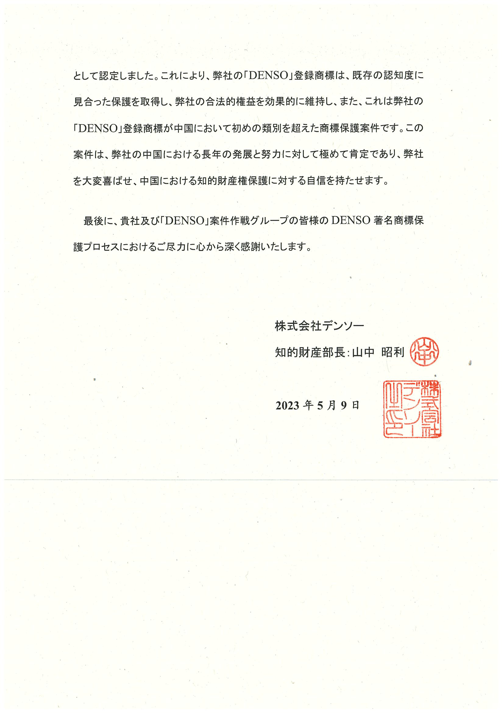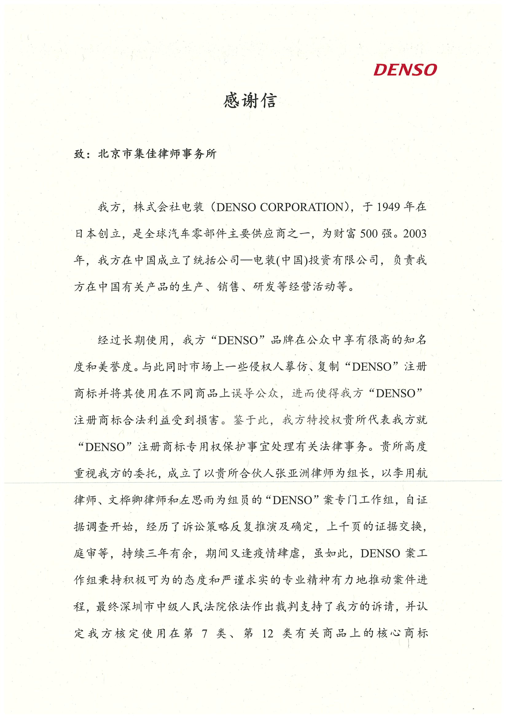 上述案件是“DENSO”注冊商標(biāo)在中國首個實現(xiàn)跨類別保護(hù)的案件,通過該案,集佳成功代理客戶使其“DENSO”注冊商標(biāo)獲得了與已有知名程度相適應(yīng)的保護(hù)力度,有效地維護(hù)了客戶的合法權(quán)益。