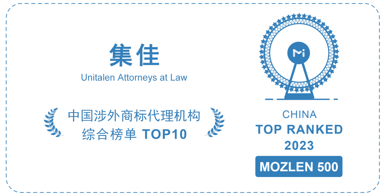 近日,業(yè)內(nèi)領(lǐng)先的商標AI檢索及管理平臺摩知輪重磅發(fā)布《MOZLEN 500》中國涉外商標代理機構(gòu)全球榜單,在中國國家知識產(chǎn)權(quán)局備案的近2萬家商標代理機構(gòu)中,集佳憑借杰出的國際客戶商標代理經(jīng)驗、業(yè)務綜合實力和國際影響力在“中國500家涉外商標代理機構(gòu)綜合排名” 中位列 TOP 10,被評為 AAA +++(最高級別),并在諸多重點國家業(yè)務排名中表現(xiàn)突出被獲得重點推薦。