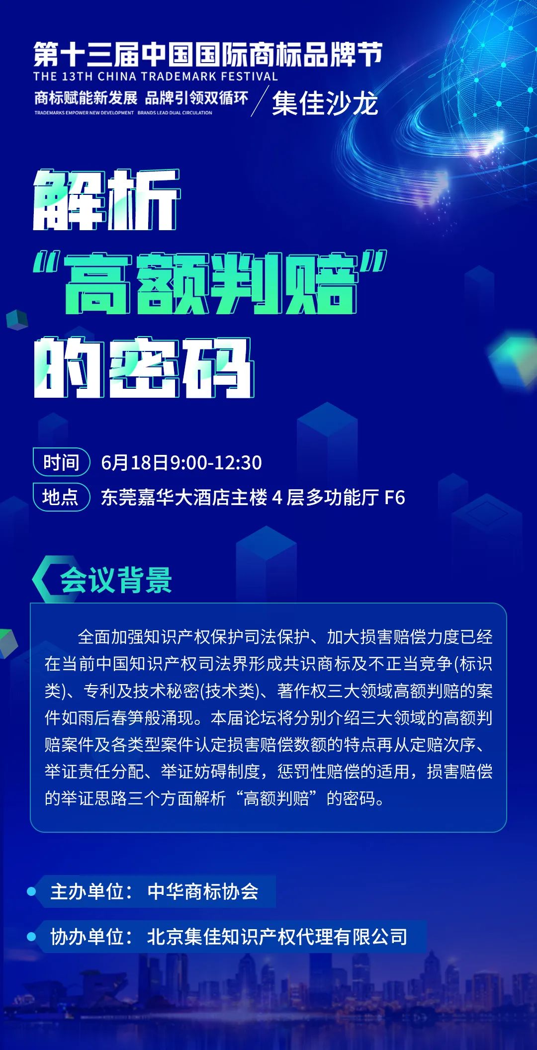 6月18日,集佳沙龍將在東莞嘉華大酒店主樓4層多功能廳F6舉辦,邀請資深法官、律師等眾多知名專家,共同解析知識產(chǎn)權(quán)案件“高額判賠”的密碼,屆時期待您的光臨!