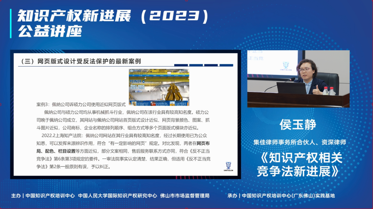 2023年9月7日,由中國知識(shí)產(chǎn)權(quán)培訓(xùn)中心、中國人民大學(xué)國際知識(shí)產(chǎn)權(quán)研究中心、佛山市市場監(jiān)督管理局聯(lián)合主辦的“知識(shí)產(chǎn)權(quán)新進(jìn)(2023)公益講座”在中國知識(shí)產(chǎn)權(quán)培訓(xùn)中心(廣東佛山)實(shí)踐基地舉行,集佳合伙人侯玉靜律師應(yīng)邀參加公益講座并發(fā)表主題演講。