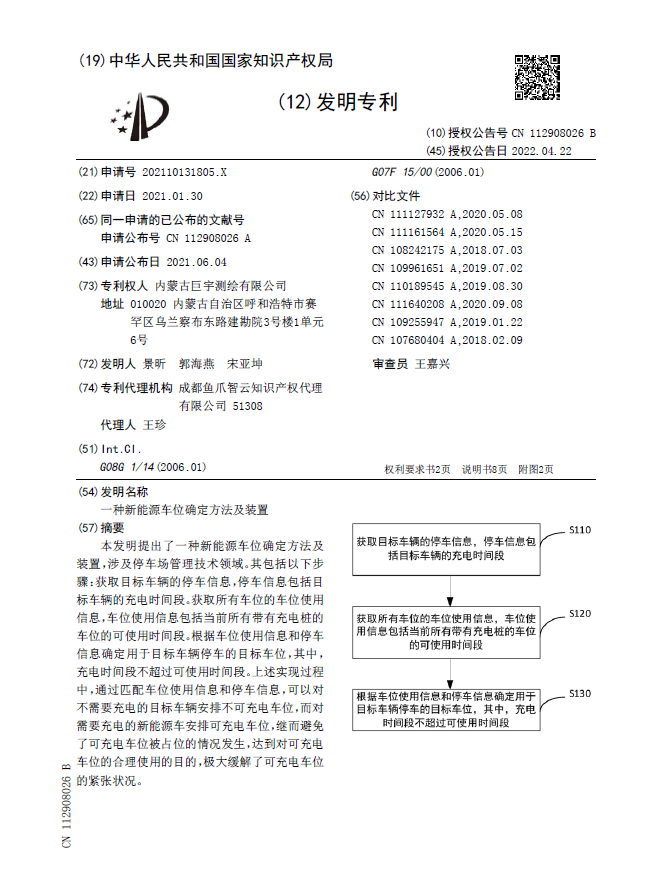 2023年9月,集佳律所接受客戶委托代理發(fā)明專利無效宣告請求,涉案專利名為“一種新能源車位確定方法及裝置”的發(fā)明專利ZL202110131805.X,該專利共有7項權(quán)利要求,包括3項獨立權(quán)利要求,申請日為2021年1月30日,并于2022年4月22日獲得授權(quán)。涉案專利所保護的技術(shù)方案涉及新能源車輛停車信息與充電場站及充電車位匹配的方法及裝置。