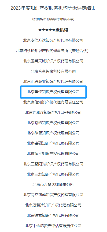 2024年2月4日,首都知識產(chǎn)權(quán)服務(wù)業(yè)協(xié)會公布2023年度知識產(chǎn)權(quán)服務(wù)機(jī)構(gòu)等級評定結(jié)果,北京集佳知識產(chǎn)權(quán)代理有限公司憑借穩(wěn)健的綜合實(shí)力獲得各界肯定,獲評首批最高等級——AAAAA級知識產(chǎn)權(quán)服務(wù)機(jī)構(gòu)。