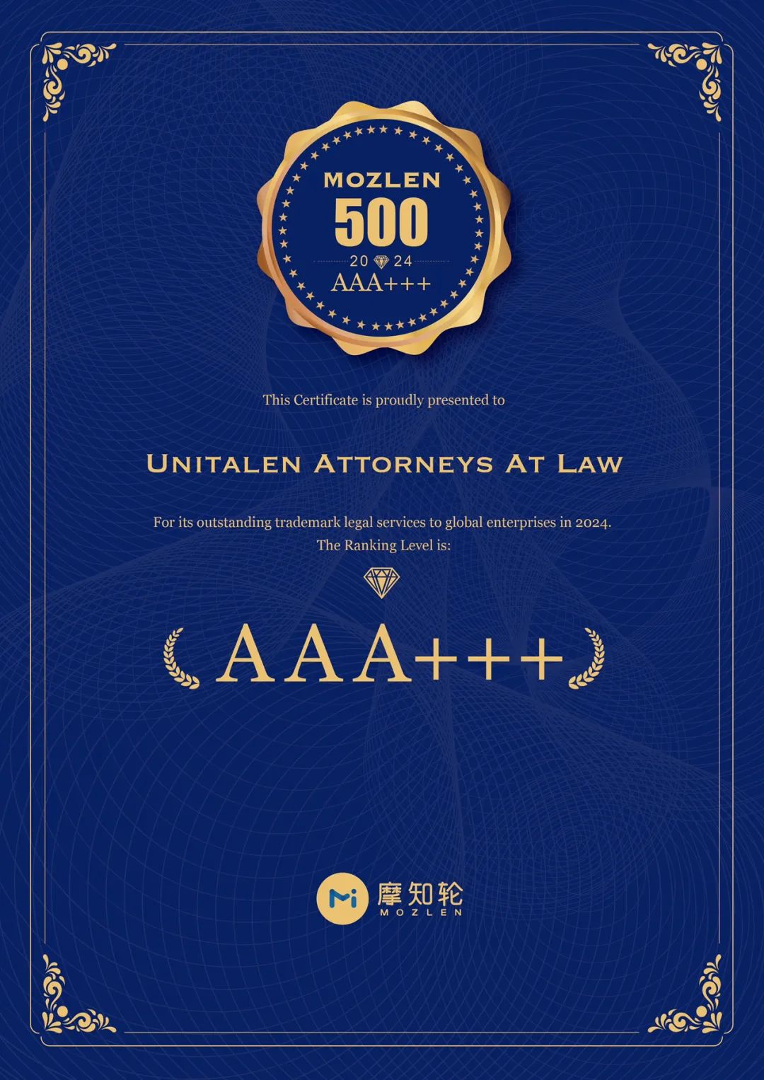 在本次年會上,業(yè)內領先的商標AI檢索分析及管理平臺摩知輪也重磅發(fā)布2024《MOZLEN 500》中國涉外商標代理機構全球榜單,集佳憑借杰出的國際客戶商標代理經(jīng)驗、業(yè)務綜合實力和國際影響力在中國500家涉外商標代理機構綜合排名中位列“TOP10”,被評為“鉆石AAA +++”級(最高級別),并在諸多重點國家業(yè)務排名中表現(xiàn)突出,獲得重點推薦。