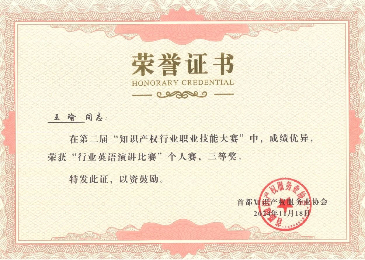 本屆大賽以“激揚創(chuàng)新夢想 鑄就精彩人生”為主題,秉持公平公正的原則,以展現知識產權人的職業(yè)風采、提升知識產權從業(yè)人員專業(yè)水平、引領知識產權行業(yè)向高質量發(fā)展為目標,為行業(yè)青年人才提供了交流、展示、歷練的平臺?!靶袠I(yè)英語演講比賽”檢驗從業(yè)人員專業(yè)英文口語表達能力;“商標綜合技能比賽”檢驗從業(yè)人員商標檢索、制定商標確權策略,撰寫確權方案的能力。比賽中,集佳參賽選手通過精彩的演講與答辯,展現了出色的專業(yè)能力與良好的團隊協作精神,受到評委們的一致好評。